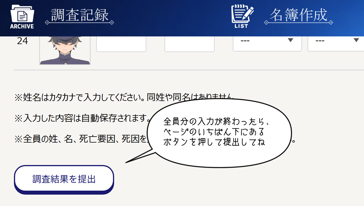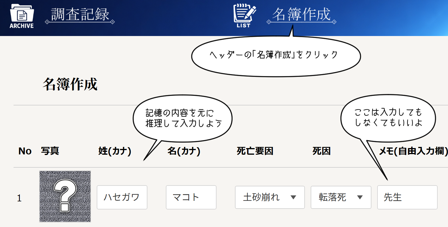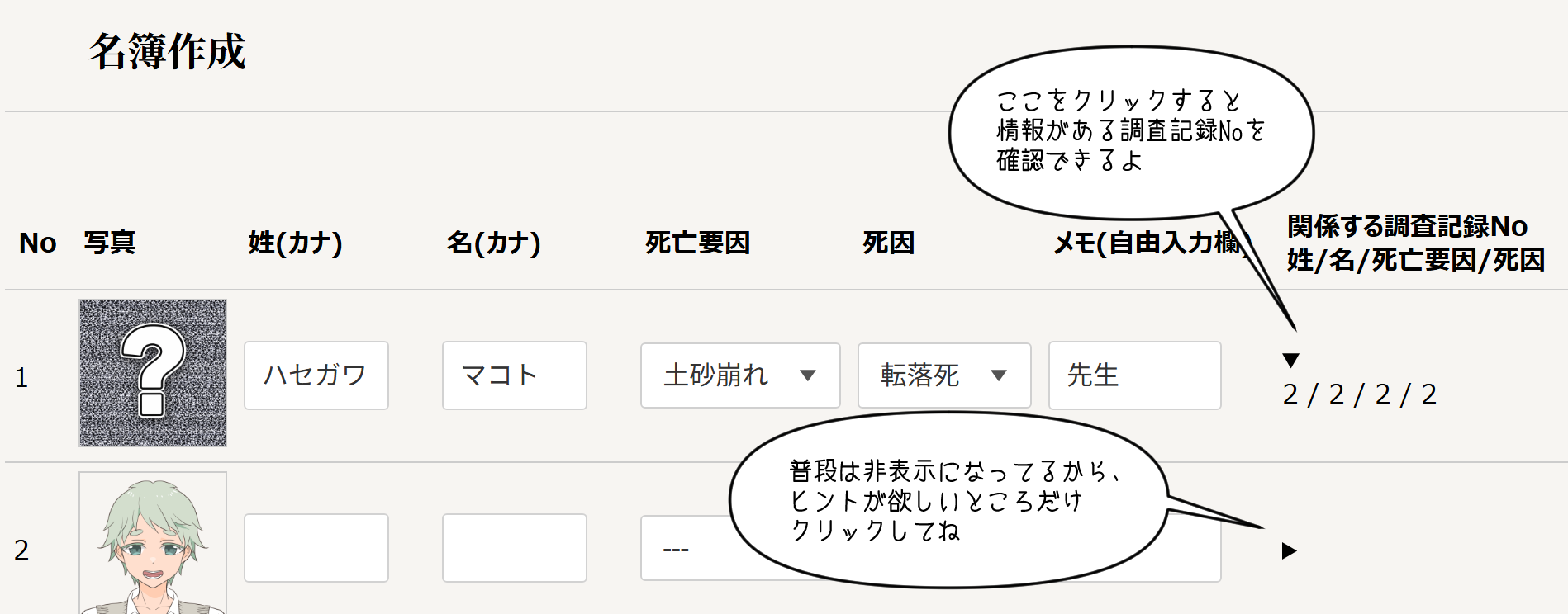 次は、事故に遭ったバスに乗車していた人たちの名簿を作成してほしい。 名簿に必要な情報は「氏名」、「死因」、それから「死亡要因」。 「氏名」と「死因」は通常の捜査で判明してるけど、 超能力の正確性を担保するために、私たちには明かされていないの。 「死亡要因」っていうのは、「死に関与した人物・現象」 または「故意に死亡させる行動を誘導した人物」のことだよ。 調査記録をよく読んで、名簿を完成させてね。