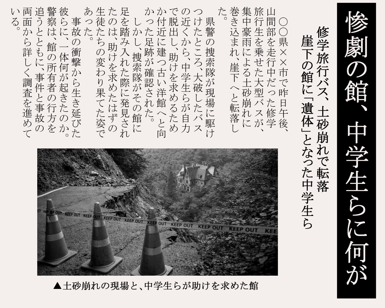 事件の概要を説明するっす。 修学旅行中の中学生を乗せたバスが、山で土砂崩れに遭ったっす。 崖の下で生き延びた彼らは、近くにある館へ助けを求めに行ったみたいっすね。 でも、館で見つかったのは彼らの死体だけだったっす。